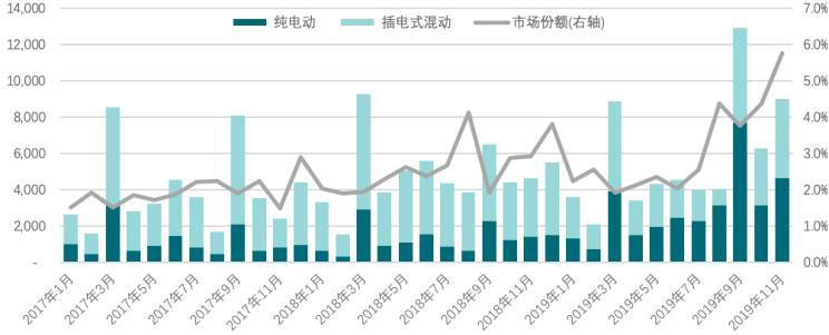 2019年前11個月,英國乘用車市場累計銷量為216.2萬輛,與去年同期相比下降2.7%。新能源乘用車累計銷量63165輛,同比增長20.3%,所占市場份額與去年同期相比提升0.5個百分點至2.9%。其中,純電動乘用車累計銷量31911輛,同比增長135.6%,市場份額較上年同期提升0.9個百分點至1.5%;插電式混合動力乘用車累計銷量30254輛,同比下降21.5%,所占市場份額較上年同期下降0.3個百分點至1.4%。插電式混合動力乘用車銷量的下跌主要在于英國政府已經停止對插電式混合動力乘用車補貼的發(fā)放,并將純電動乘用車的補貼從4500英鎊(約合4.16萬人民幣)減少到3500英鎊(約合3.24萬人民幣)。
