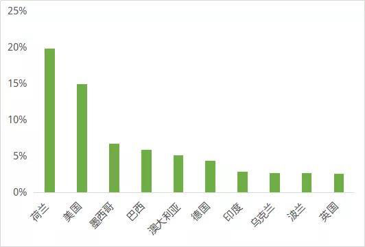 分國別看,有12個國家三季度逆變器出口金額超過500萬美元,前20個國家出口金額占比在80%。排名前列的出口國中,對荷蘭、美國、墨西哥、巴西、澳大利亞、德國出口額達到千萬美元水平。