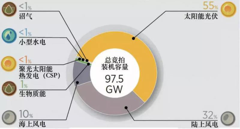 圖片:2017-2018年,可再生能源發(fā)電裝機的競拍規(guī)模約為97.5GW。其中,太陽能光伏的占比超過一半,陸上風電約占1/3