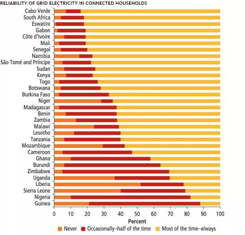 在有電網(wǎng)的地方,不穩(wěn)定還會引起其他問題。最近的一項調(diào)查發(fā)現(xiàn),大多數(shù)尼日利亞科技公司每月面臨30次或更多的停電,并且超過一半的人將電力視為開展業(yè)務(wù)的“主要”或“嚴重”限制。