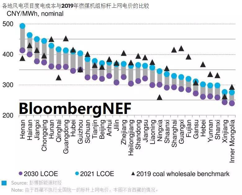 2021年,中國陸上風電將實現(xiàn)全面平價,中國風電行業(yè)增長或受阻力。建造成本等于或低于燃煤機組標桿上網(wǎng)電價的項目的重擔就落到了開發(fā)商的肩上。到2030年,BNEF預計新項目的平準化成本會比現(xiàn)在低30%,31省中將有27省具備平價條件。