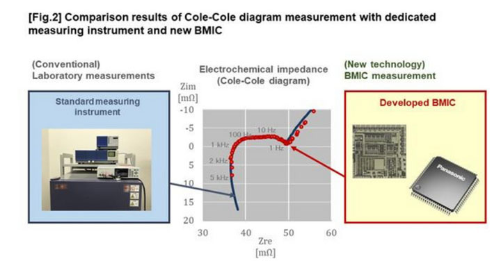 通過測量用復數(shù)阻抗繪制的Cole-Cole圖,利用電化學阻抗譜進行狀態(tài)評估。立命館大學使用松下公司開發(fā)的BMIC和測量軟件,對圓柱形鋰離子電池進行了測量。結果表明,Cole-Cole圖可以在1 Hz到5 KHz的頻率范圍內測量繪制,并達到與工業(yè)用標準測量儀器相同的精度。