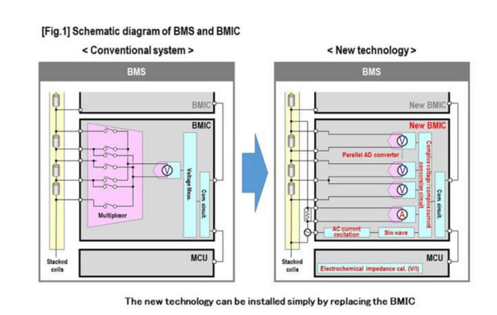 除了傳統(tǒng)功能,新開發(fā)的BMIC測試芯片還內置電化學阻抗測量功能,利用交流電勵磁法進行測量。電化學阻抗測量是通過15個完全并聯(lián)模擬/數(shù)字轉換器、0.1 Hz到5khz的脈沖調制交流電勵磁電路,以及內置在BMIC中的復數(shù)電壓/復數(shù)電流轉換電路來實現(xiàn)的。因此,BMIC芯片可以測量電池運行時的電化學阻抗,而不需要對目前電池中的BMS配置進行重大調整。