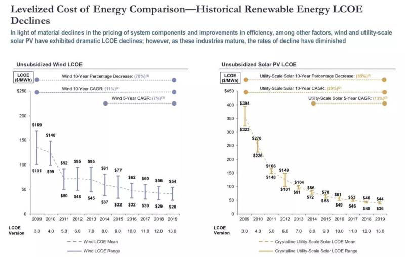 從平準(zhǔn)化成本變化趨勢(shì)來(lái)看,2009年到2019年陸上風(fēng)電LCOE下降70%,10年來(lái)年平均下降11%;大型地面光伏LCOE下降89%,10年來(lái)年平均下降20%。