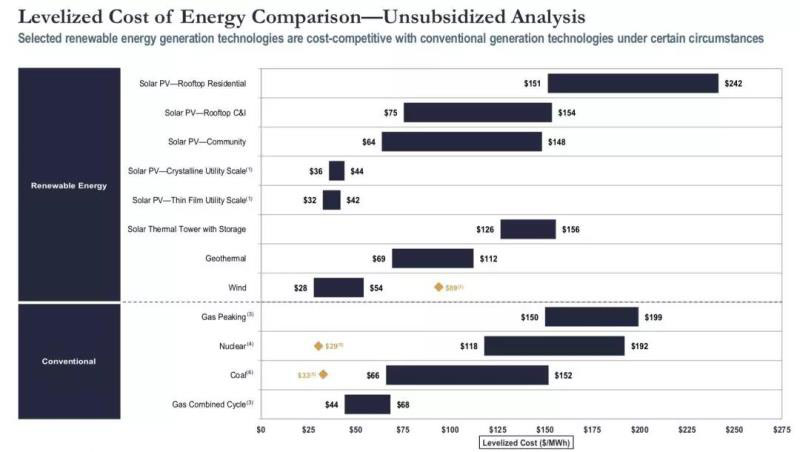 在不考慮聯(lián)邦政府稅收優(yōu)惠的情況下,美國(guó)各類能源發(fā)電平準(zhǔn)化成本的區(qū)間如下: