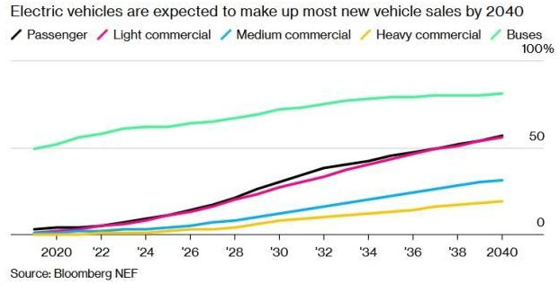 到2040年,電動(dòng)汽車預(yù)計(jì)將占新車銷售的大部分。