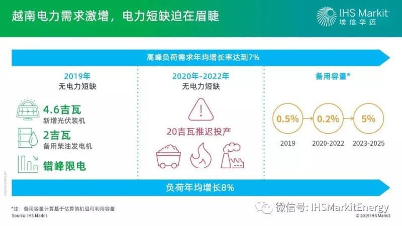 在2019年高溫天氣時段,水庫水位下降導致水電可利用容量銳減的不利條件下,越南仍成功避免了電力短缺的局面。這要歸功于三點。首先,EVN公開呼吁居民和企業(yè)節(jié)約用電;其次,EVN動用了約2吉瓦成本高昂的柴油發(fā)電;第三,在2019年6月30日光伏補貼截止日期之前,光伏裝機規(guī)模大增4.6吉瓦。