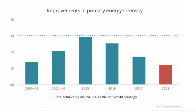 國際能源署(IEA)發(fā)布2019年版能源效率報告(Energy Efficiency 2019),指出2018年全球一次能源強(qiáng)度(衡量全球經(jīng)濟(jì)用能量的重要指標(biāo))僅改善了1.2%,明顯低于2017年1.7%的改善速度,這是該比率連續(xù)第三年下降,為2010年以來的最低水平。這也遠(yuǎn)低于IEA在2018年能源效率報告中首次提出的“高效世界戰(zhàn)略”(Efficiency World Strategy)的3%的平均改善率。