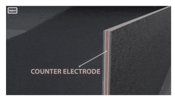 在這項(xiàng)研究中,MIT科學(xué)家沒(méi)有使用傳統(tǒng)的“熱變化”或“壓力變化”吸收體,而是采用“電變化”(Electro-Swing)吸收器。由于電化學(xué)過(guò)程近乎等溫等壓,能極大地提升其能量利用效率。整個(gè)裝置的核心部件就是這個(gè)“電變化”吸收器。吸收器由三部分組成:兩片涂有能吸附二氧化碳的蒽醌聚合物納米管涂層的電極,中間是聚乙烯二茂鐵納米管復(fù)合材料制成的電極。在陰陽(yáng)極之間是絕緣材料。作者在論文發(fā)布后還在網(wǎng)上發(fā)布了裝置的介紹視頻。整個(gè)裝置的結(jié)構(gòu)如下圖: