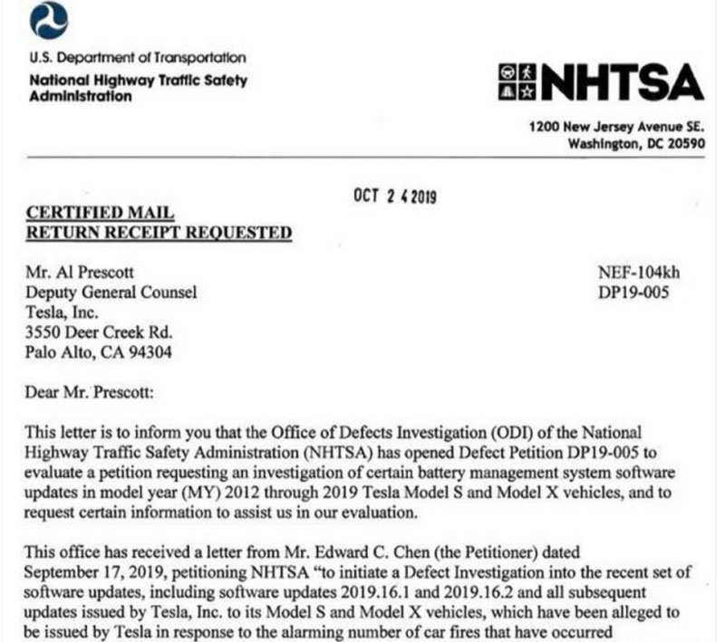 NHTSA的缺陷調(diào)查辦公室在收到了這封請(qǐng)?jiān)笗?,?0月1日開始著手調(diào)查特斯拉汽車在全球范圍內(nèi)發(fā)生的自燃事件。