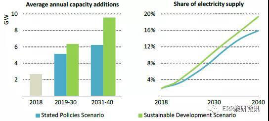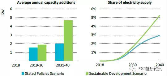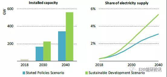 預(yù)測(cè)的全球海上風(fēng)電裝機(jī)容量和在電力供應(yīng)中的份額,按情景劃分