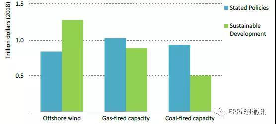 2019~2040年世界范圍內(nèi)在海上風(fēng)電、氣電和煤電裝機(jī)上的累計(jì)資本開(kāi)支,按情景劃分