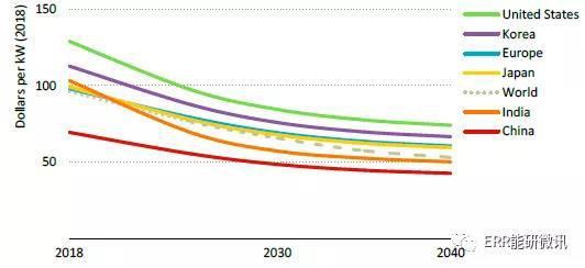 2018~2040年歐盟、中國(guó)和美國(guó)新建海上風(fēng)電項(xiàng)目的平準(zhǔn)化度電成本