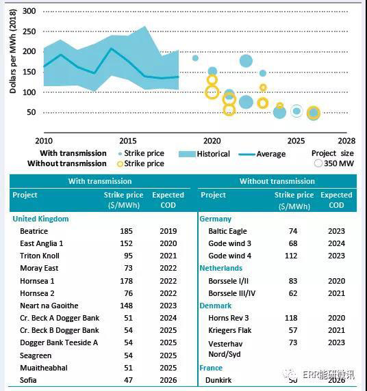 海上風(fēng)電的歷史平準(zhǔn)化度電成本和歐洲最近競(jìng)價(jià)中的成交價(jià)