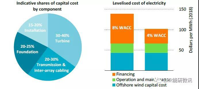 2018年完成的海上風(fēng)電項(xiàng)目資本成本占比,按組成和平準(zhǔn)化度電成本劃分