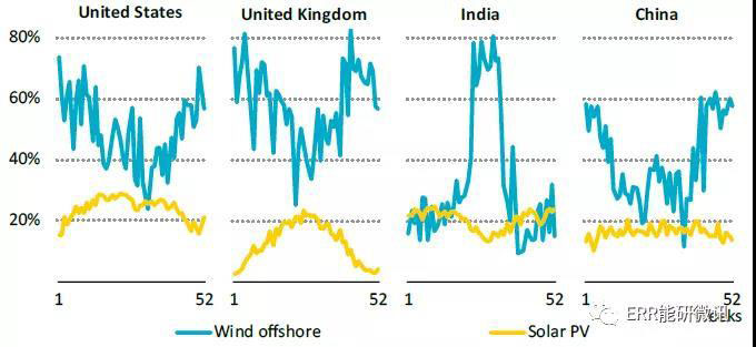 因?yàn)楦蟮臏u輪機(jī)和其他技術(shù)改進(jìn)正在幫助充分利用可用的風(fēng)能資源,新的海上風(fēng)電項(xiàng)目具有40~50%的容量系數(shù)。盡管海上風(fēng)力并非隨時(shí)可用,但在這些水平上,海上風(fēng)電與某些地區(qū)的燃?xì)夂腿济弘姀S的容量系數(shù)相匹配。其容量系數(shù)超過(guò)陸上風(fēng)電,約為太陽(yáng)能光伏發(fā)電的兩倍。海上風(fēng)電輸出因風(fēng)力強(qiáng)度而異,但其小時(shí)變化性低于太陽(yáng)能光伏發(fā)電。與太陽(yáng)能光伏發(fā)電相比,海上風(fēng)在較窄的區(qū)間內(nèi)波動(dòng),每小時(shí)波動(dòng)為20%,而太陽(yáng)能光伏的幅度高達(dá)40%。