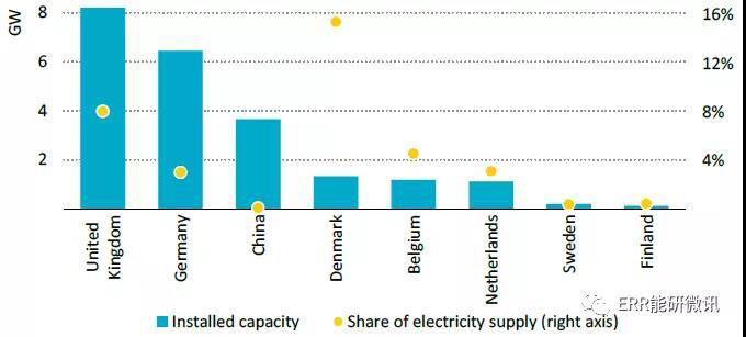 2018年海上風(fēng)電裝機(jī)容量以及電力供應(yīng)份額,按國(guó)家劃分
