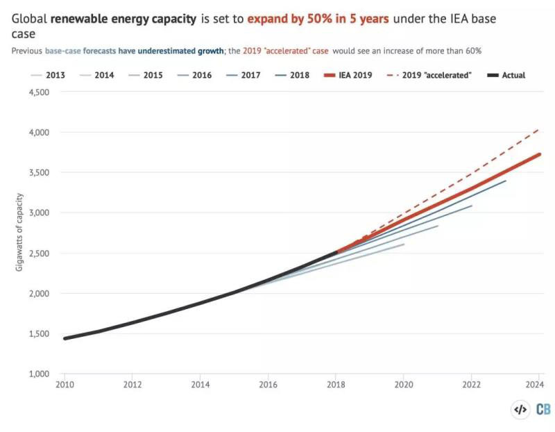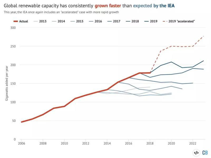 值得注意的是,正如上圖所示,IEA的“基本情況”預(yù)測在歷史都低估了增長速度。這一次IEA在其2019年預(yù)測中還包括了“加速發(fā)展”(accelerated