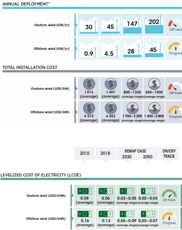 如表所示,全球風(fēng)電(包括陸上、海上)的發(fā)電量占總發(fā)電量的比例將從2018年的6%增至2030年的21%、2050年的35%;2050年陸上風(fēng)電裝機(jī)將達(dá)5044吉瓦、海上風(fēng)電1000吉瓦;陸上風(fēng)電投資成本將降至650-1000美元/千瓦、海上風(fēng)電降至1400-2800美元/千瓦。
