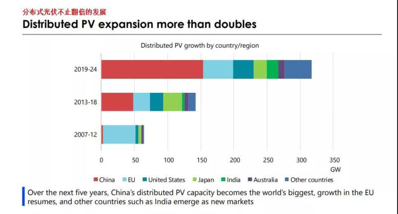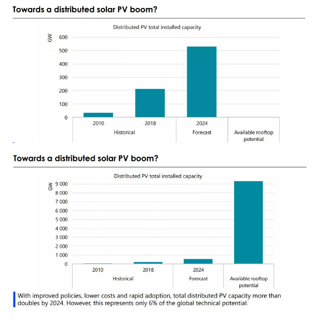 在經(jīng)濟(jì)狀況改善、完善的政策支持、有效的監(jiān)管等各個(gè)有利條件下,到2024年,分布式光伏的全球裝機(jī)容量可超過600吉瓦,幾乎是日本總電力裝機(jī)的兩倍。而這還僅僅是分布式光伏技術(shù)潛力的6%(基于可用屋頂總面積)。