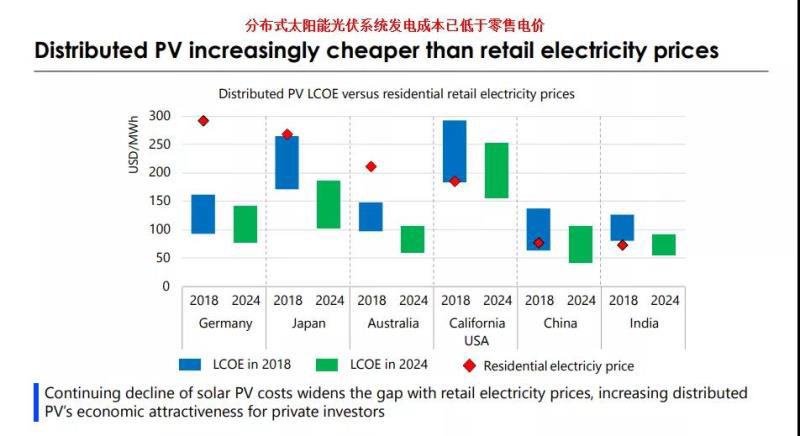 在大多數(shù)國家,使用分布式太陽能光伏系統(tǒng)發(fā)電的成本已經(jīng)低于零售電價(jià)。IEA預(yù)測,到2024年,這些成本將進(jìn)一步下降15%至35%,這將使該技術(shù)更具吸引力,并推動(dòng)全球范圍內(nèi)的采用。