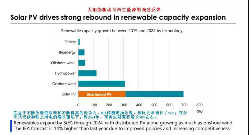 報(bào)告預(yù)測,2019年至2024年期間,全球可再生能源裝機(jī)量將達(dá)到1200GW,增長50%;可再生能源在全球發(fā)電中的比重將從今天的26%上升到2024年的30%。其中,光伏將占新增裝機(jī)中的60%左右。