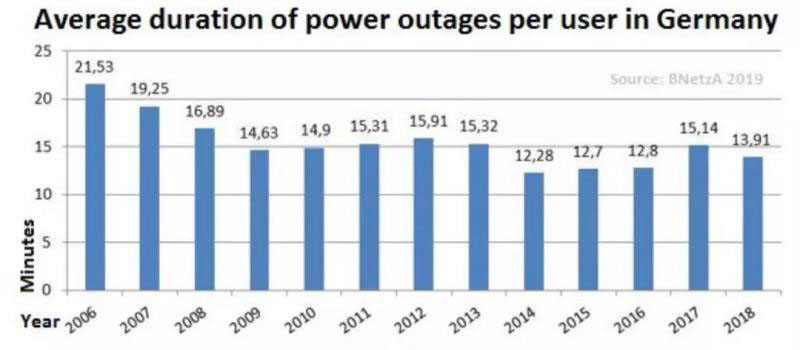 根據(jù)德國聯(lián)邦網(wǎng)絡(luò)局(BNetzA),德國每位用戶的平均停電時(shí)間從2006年的21.53分鐘以上減少到2018年的13.9分。BNetzA表示:“能源轉(zhuǎn)型和分散發(fā)電的份額不斷增加,對供應(yīng)質(zhì)量沒有任何負(fù)面影響?!盉NetzA的分析記錄了持續(xù)超過三分鐘的所有停電情況,2018年總計(jì)有167,400次停電,這是自記錄保存以來的第二低值。
