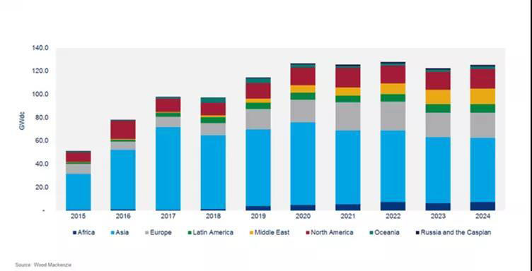 Wood Mackenzie還預(yù)測了2019年全球太陽能市場將比2018年增長18%,達(dá)到114.5GW的新高,到2024年,全球年新增裝機量將突破120GW至125GW。