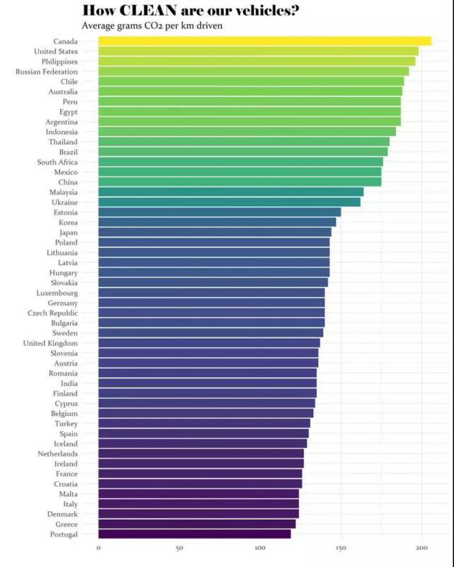 根據(jù)國際能源署(IEA)的全球汽車燃油經(jīng)濟(jì)研究計劃(The Global Fuel Economy Initiative)的數(shù)據(jù)(全球輕型車統(tǒng)一測試規(guī)程),2017年全球各經(jīng)濟(jì)體輕型燃油汽車平均碳排放如下: