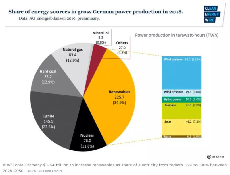 如果2025年到2050年間德國將可再生能源電力從今天的35%增加到100%,德國將需要花費大約3.4萬億歐元(3.8萬億美元),是2000年至2025年花費的7倍。