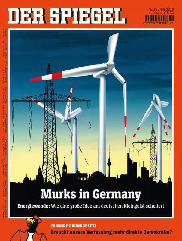 德國最大的新聞周刊“明鏡”(Der Spiegel)發(fā)表封面文章,題目是“Murks in Germany”(德國干的蠢事”,封面配圖表現(xiàn)的是破碎的風力發(fā)電機、不完整的電力傳輸塔與柏林的黑暗輪廓。