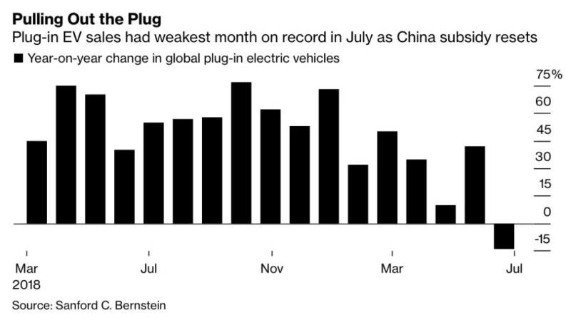 據(jù)彭博新聞社報(bào)道,2019年7月份全球售出12萬(wàn)輛插電式電動(dòng)汽車,比去年同期下降14%。這是歷史上全球電動(dòng)汽車銷售量首次出現(xiàn)同比下降,其原因值得關(guān)注。彭博新聞社認(rèn)為,這主要是因?yàn)橹袊?guó)對(duì)電動(dòng)汽車補(bǔ)貼退坡,加上貿(mào)易戰(zhàn)陰影下經(jīng)濟(jì)放緩影響了消費(fèi)者的購(gòu)車信心。