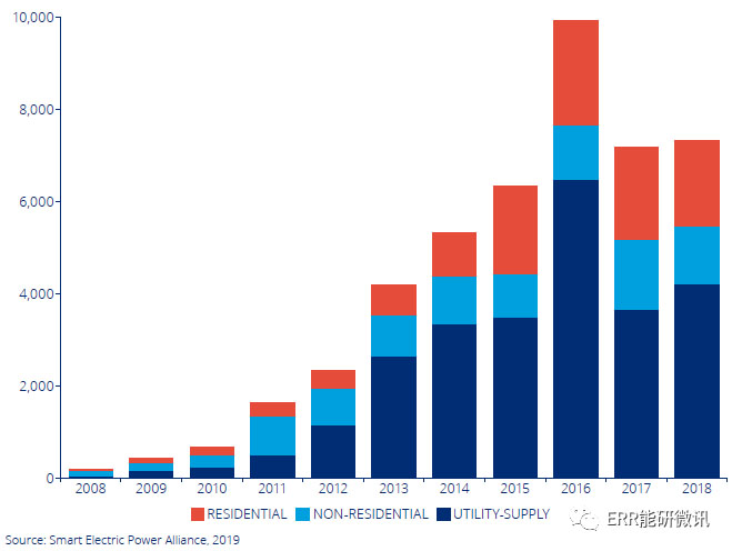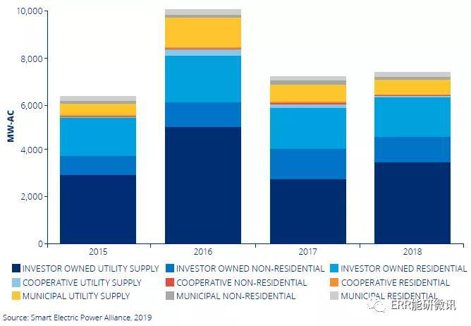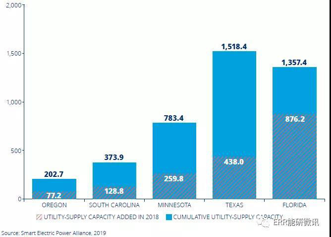 公用事業(yè)供給—總體而言,2018年市場增長率增長了15.1%,全國并網(wǎng)4174.3MW。佛羅里達州,得克薩斯州和明尼蘇達州的公用事業(yè)供應(yīng)市場在2018年呈現(xiàn)強勁增長。