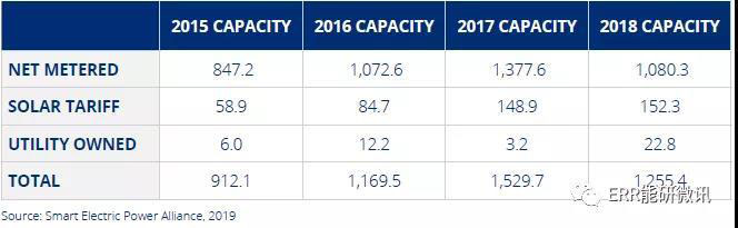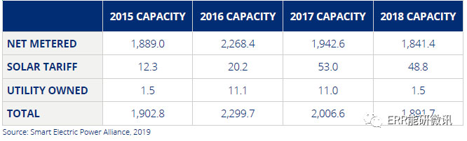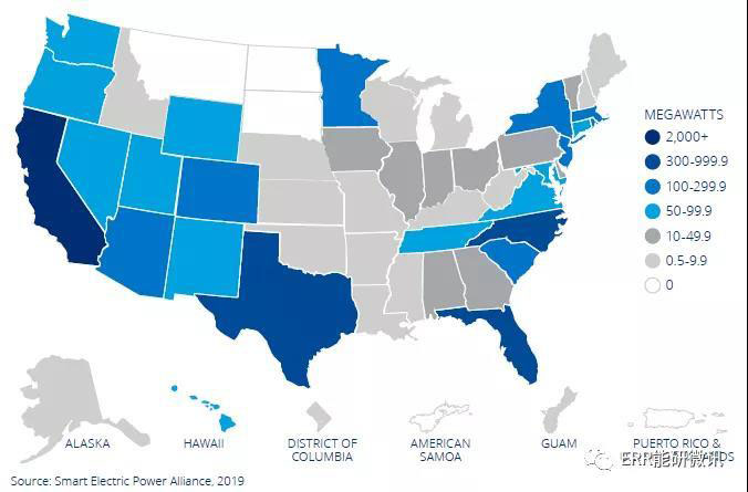 亞利桑那州、紐約州和新澤西州的公用事業(yè)在2017年和2018年的居民部門裝機容量中排名前五,但是新增系統(tǒng)比上年新增系統(tǒng)總數(shù)減少了12566個,總裝機容量減少了87.4MW。
