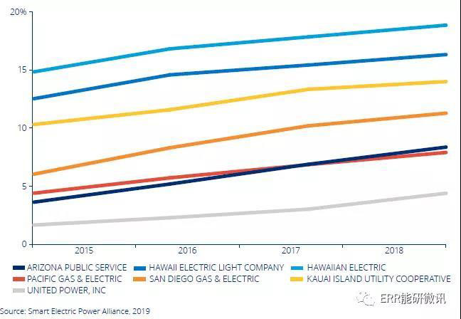 加州并不是2018年唯一持續(xù)的居民部門市場。在夏威夷,夏威夷電力公司繼續(xù)部署居民,滲透率達到其居民客戶賬戶的18.9%。