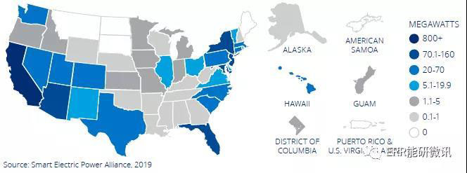 2018年,新增太陽能裝機容量為7.3GW,比2017年增長2.2%,累計裝機容量為49.7GW。雖然市場似乎保持穩(wěn)定,但必須注意的是,2016年和2017年都是市場經(jīng)歷“反應(yīng)式增長”的年份,這是由于投資稅收抵免(ITC)在2016年底前即將落幕之前,急于部署項目所致。其中許多項目是在2016年開發(fā)的,但在2016年底ITC延期后,其運營日期推遲到2017年。簡言之,盡管2018年太陽能電池板和鋼鐵關(guān)稅對成本影響較小,但由于太陽能光伏仍具有競爭力,因此國家太陽能市場仍然保持穩(wěn)健。事實上,該市場的地域擴張超過了傳統(tǒng)的發(fā)電站市場(如加利福尼亞和北卡羅來納),佛羅里達、華盛頓和羅德島的同比增長率分別為311.9%、150.2%和344.1%。
