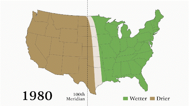 中國儲能網(wǎng)訊:美國本土100度子午線將美國潮濕的東部與干燥的西部分開,這條線穿過北達科他州、南達科他州、內(nèi)布拉斯加州、堪薩斯州、俄克拉荷馬州和德克薩斯州,這些州是美國的糧倉。一旦你越過分界線,東方雨水浸透的草叢就會變成塵土飛揚的平原,偶爾會有仙人掌點綴在景觀中。但是,據(jù)YaleEnvironment360報道,由于氣候變化這個著名的分界線自1980年以來向東移動了140英里。