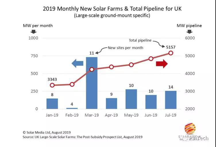 2019年年初的項目為3.34GW。但僅僅在過去的五個月,英國就新增了54個大型太陽能項目,許多原始開發(fā)商(英國首批8.5GW已完工大型太陽能電站的開發(fā)商)已重新回歸到未開發(fā)項目的識別和規(guī)劃工作。