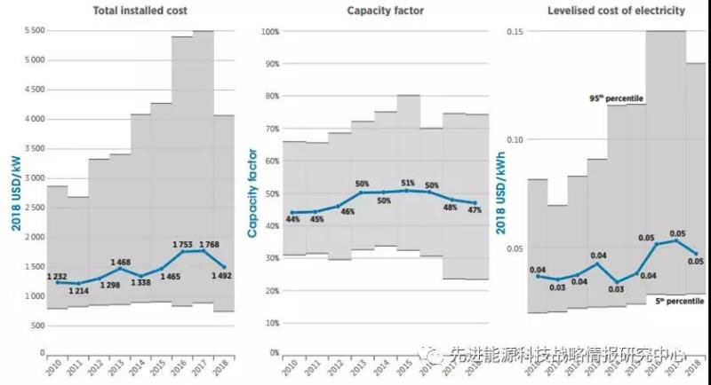 圖2 2010-2018年間CSP全球加權(quán)平均裝機(jī)成本(單位:美元/千瓦)、容量因子和LCOE(單位:美元/千瓦時(shí))變化態(tài)勢(shì)