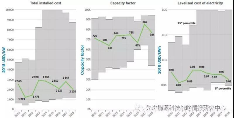 圖6 2010-2018年間地?zé)岚l(fā)電全球加權(quán)平均裝機(jī)成本(單位:美元/千瓦)、容量因子和LCOE(單位:美元/千瓦時(shí))變化態(tài)勢(shì)