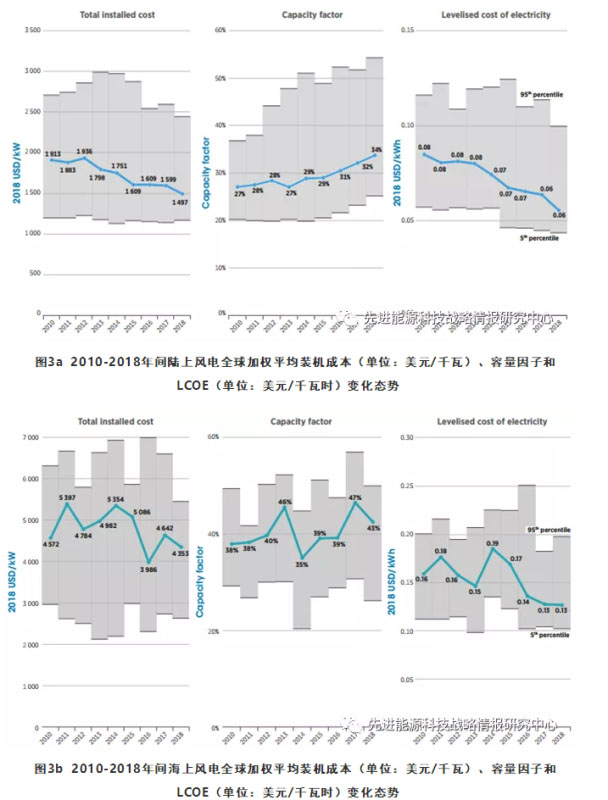 圖5 2010-2018年間水力發(fā)電全球加權(quán)平均裝機(jī)成本(單位:美元/千瓦)、容量因子和LCOE(單位:美元/千瓦時(shí))變化態(tài)勢(shì)