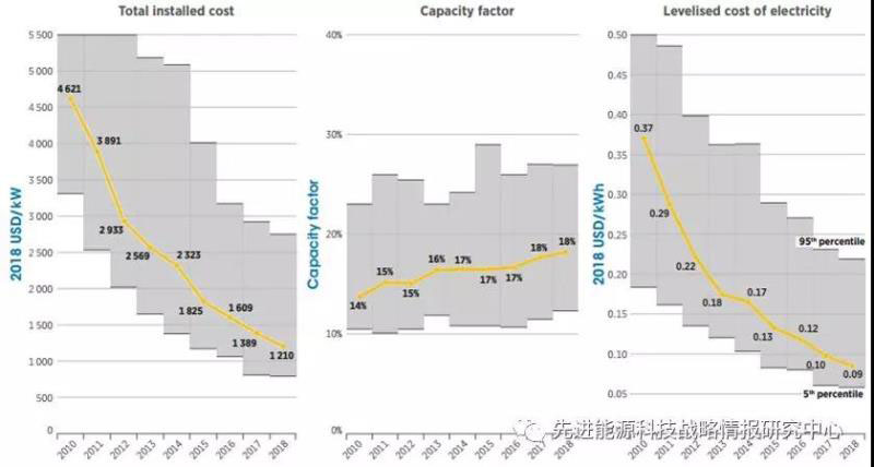 圖1 2010-2018年間太陽(yáng)能光伏全球加權(quán)平均裝機(jī)成本(單位:美元/千瓦)、容量因子和LCOE(單位:美元/千瓦時(shí))變化態(tài)勢(shì)