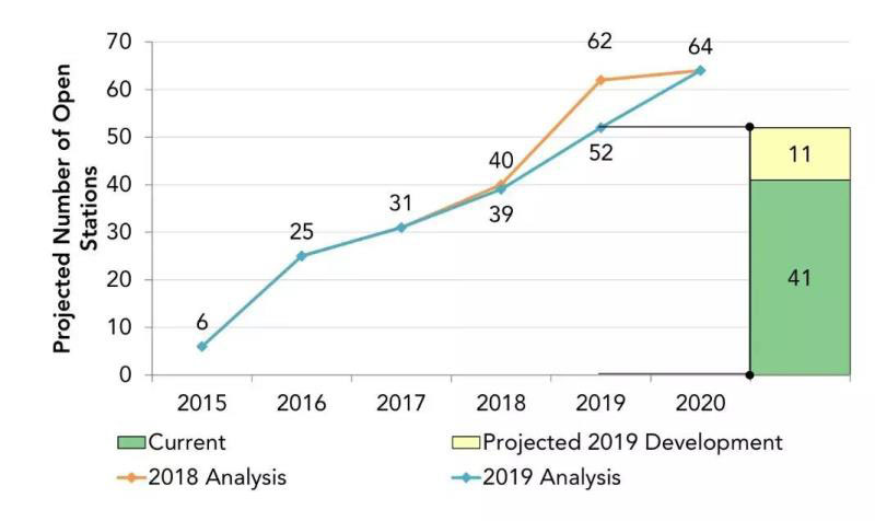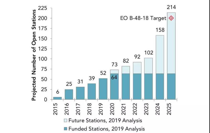 二、2018-2019年加氫網(wǎng)絡(luò)建設(shè)基本上按計(jì)劃實(shí)施。2020年6月前,將開放11個(gè)加氫站,屆時(shí)合計(jì)擁有52個(gè)加氫站,略低于此前預(yù)計(jì)的2019年底62個(gè)加氫站運(yùn)營(yíng)的目標(biāo)。但所有64個(gè)受資助的加氫站預(yù)計(jì)仍將在2020年底前開放,甚至將提前建成。