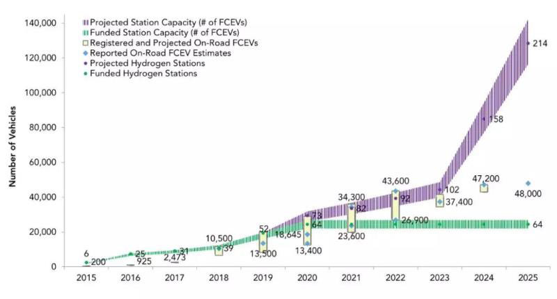 (當(dāng)前加州燃料電池汽車與規(guī)劃部署規(guī)模對(duì)比)