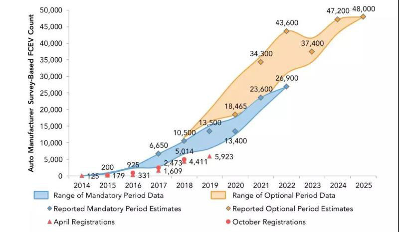 三、汽車制造商對(duì)燃料電池汽車的部署落后于EO B-48-18和CaFCP Vision中的設(shè)定目標(biāo)。目前,加州擁有5,923輛燃料電池汽車,較去年同期增加了1,500輛,短期內(nèi)需要提速。畢竟,這一數(shù)據(jù)與2017年386%和2018年174%的增速不可同日而語(yǔ),與2022年2.69萬輛和2025年4.8萬輛的預(yù)期目標(biāo)更是相去甚遠(yuǎn)。