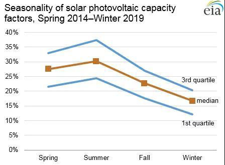 由于光照時(shí)間加長,光伏電站的性能在夏季達(dá)到峰值,與風(fēng)電形成季節(jié)性“互補(bǔ)”。光伏電站容量系數(shù)的中位數(shù):春季27.5%、夏季的30.2%、秋季的22.6%、冬季的16.7%。