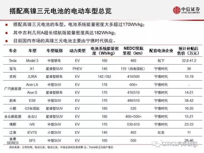 在國內(nèi)自主品牌上,已有包括吉利、廣汽、蔚來等多家車企的數(shù)十款車型宣布將應(yīng)用高鎳體系電池。而在高鎳配套上,上述車企的車型基本全部由寧德時代配套。