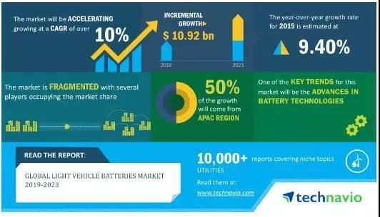 根據(jù)全球研究機(jī)構(gòu)Technavio的報(bào)告透露,2019-2023年期間,全球輕型汽車電池市場(chǎng)規(guī)模將增長(zhǎng)109.2億美元,復(fù)合年增長(zhǎng)率超過(guò)10%。