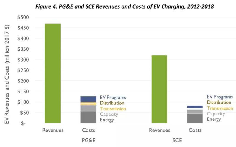 對電力公司而言,電動車是不是“賠本”買賣?美國加利福尼亞州的兩家電力公司——Pacific Gas & Electric和Southern California Edison (SCE)——實際數(shù)據(jù)來了。在這兩家公司的服務(wù)范圍內(nèi),約有38萬輛電動汽車。大部分的電動汽車車主在電力需求低谷(夜間)充電,而此時供電公司的供電邊際成本非常低,因此電力公司獲利頗豐。2012-2018年期間,兩家公司因為電動汽車充電獲得的額外售電收入與為電動汽車充電服務(wù)付出的成本相比超出5.84億美元。