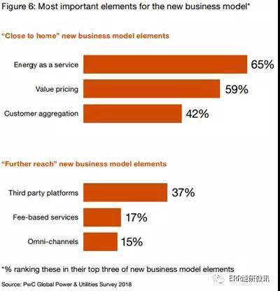 盡管出現(xiàn)了新的競爭對手,但在我們的調(diào)查中,電力企業(yè)商業(yè)模式的變化范圍似乎仍然有限。當(dāng)被要求識別和排列他們公司關(guān)注的新商業(yè)模式元素時,三分之一的人表示沒有。在剩下的部分中,大多數(shù)確定了新的業(yè)務(wù)模型元素,這些元素是其傳統(tǒng)領(lǐng)域的自然擴展,如能源即服務(wù)和價值定價,或已建立的實踐,如客戶聚合。更創(chuàng)新的舉措,如與第三方平臺進(jìn)行數(shù)字化合作,或參與全方位的客戶參與策略,只在少數(shù)受訪者的前三名中出現(xiàn)(圖6)。